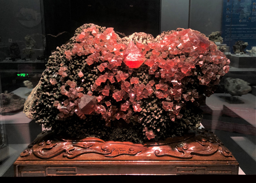 比如一,兩位老友分別專程前來“湖南省地質(zhì)博物館”,一位是湖南衛(wèi)視的領(lǐng)導(dǎo),一位是廣東來的大咖,他們之前并不知道對方會來,卻演戲似的,穿得一紅一綠,來觀賞這綠水晶之上的紅螢石。